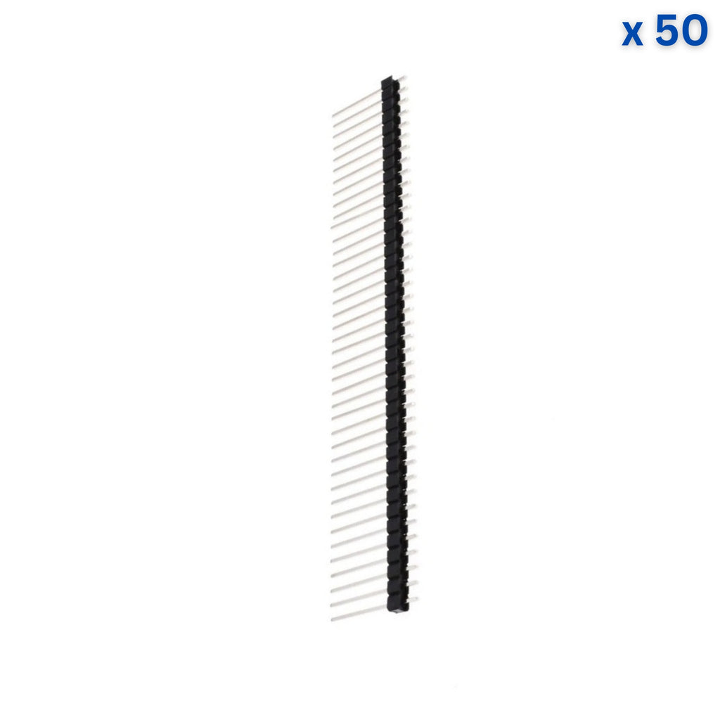 A single-row (1×40) male pin header with extra-long 25 mm gold-plated pins, ideal for applications requiring deep insertion, stacking, or connections through thick enclosures and multiple PCBs. Pins can be snapped to any required length.
